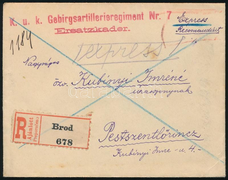 1915 Ajánlott expressz levél 8 db Turul bélyeggel / Registered express cover "BROD" (Image)(Image 1)