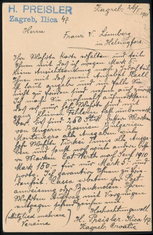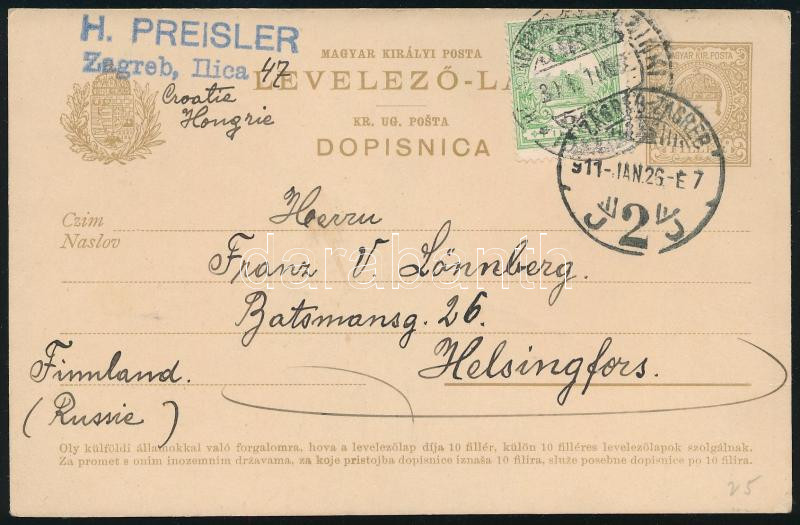 1911 Kétnyelvű díjjegyes levelezőlap Helsinkibe / Bilingual PS-card to Helsinki "ZAGREB" (Image)(Image 1)