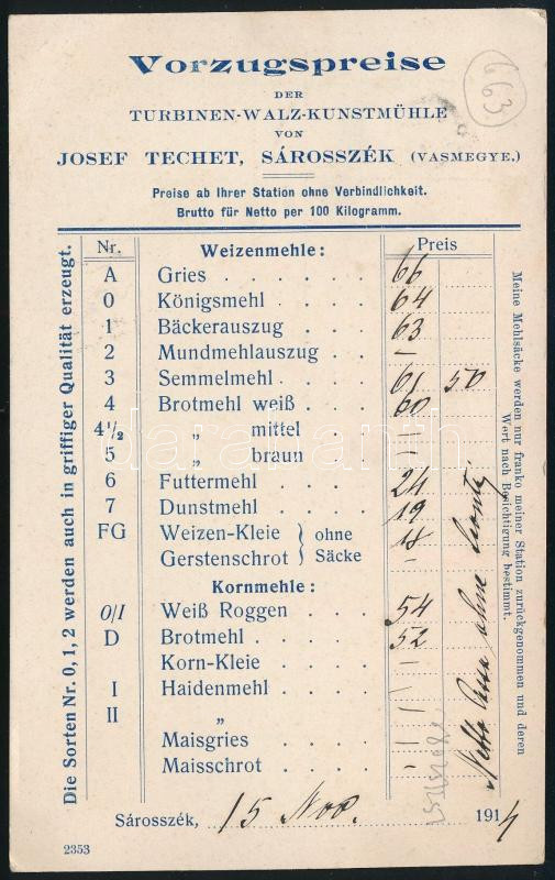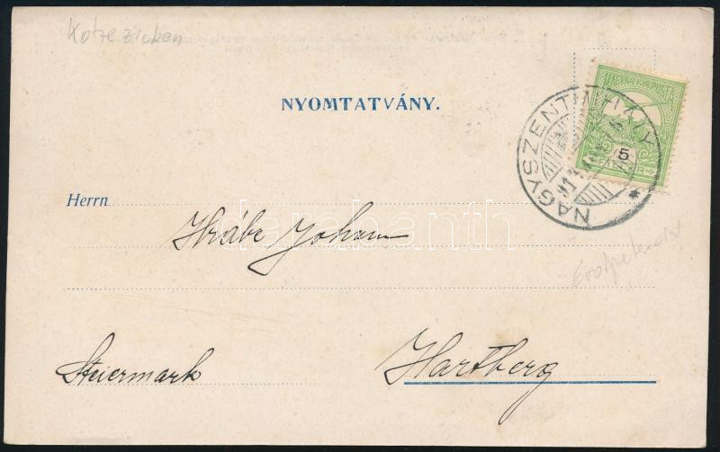 1914 Nyomtatvány Turul 5f bérmentesítéssel, a hátoldalon árlistával / Printed matter with 5f franking, "NAGYSZENTMIHÁLY" (Image)(Image 1)