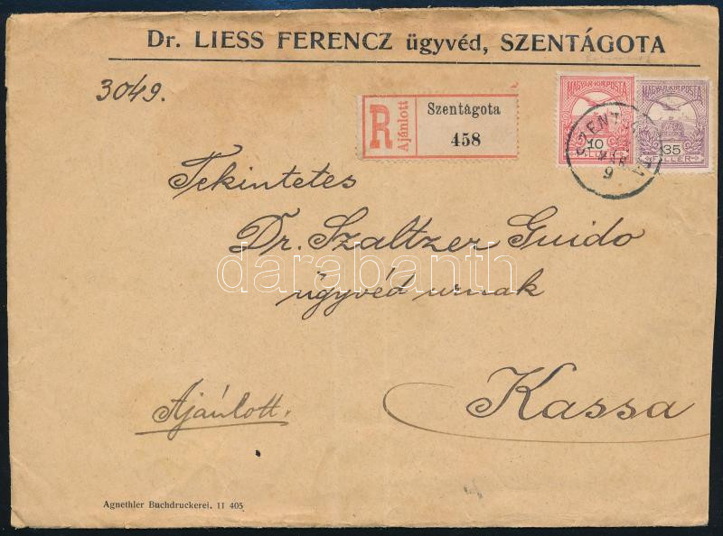 1912 Ajánlott levél 10f + 35f bérmentesítéssel / Registered cover "SZENT-ÁGOTA" - "KASSA" (Image)(Image 1)