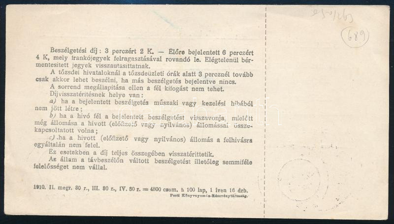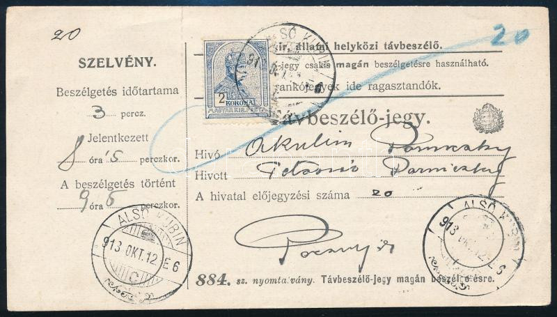 1913 Turul 2K távbeszélő jegyen / on telephone ticket, "ALSÓ KUBIN" (Image)(Image 1)
