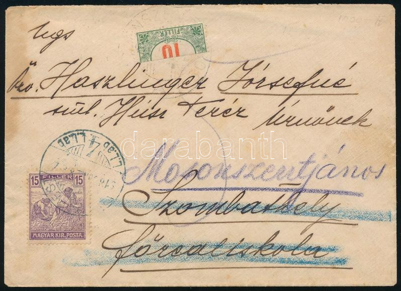 1918 Levél Arató 15f bélyeggel Budapestről Szombathelyre, onnan továbbküldve Mosonszentjánosra, ahol felezett 10f portóval portózva / Cover with 15f franking from Budapest to Szombathely, redirected to Mosonszentjános, with bisected 10f