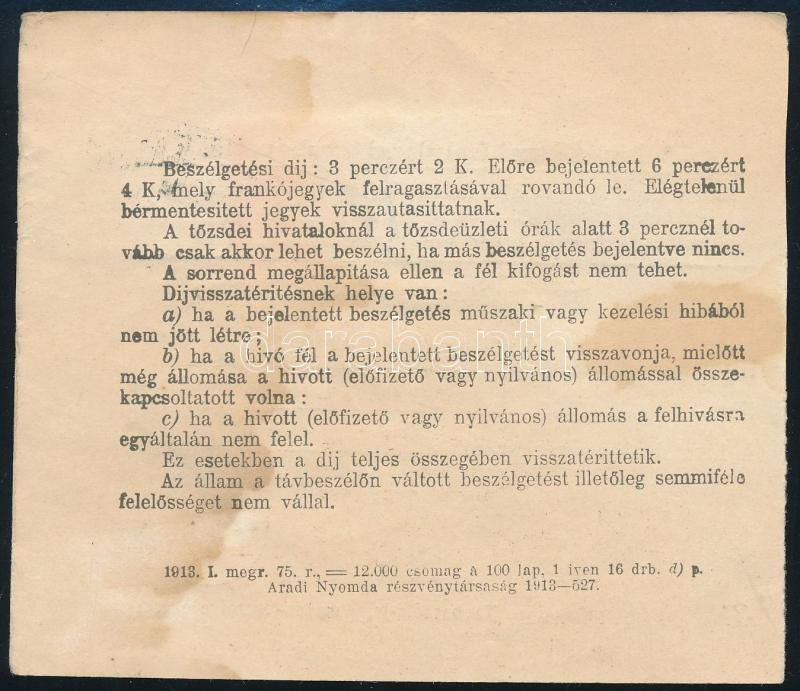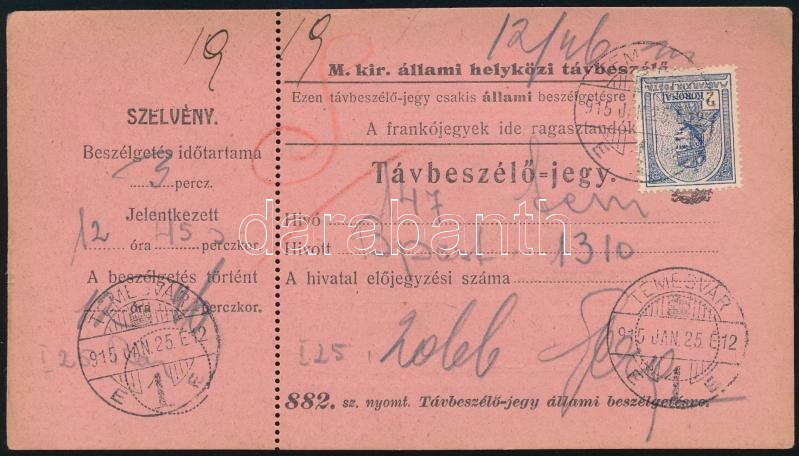 1915 Állami távbeszélőjegy 2K bérmentesítéssel "TEMESVÁR" / Telephone ticket (Image)(Image 1)