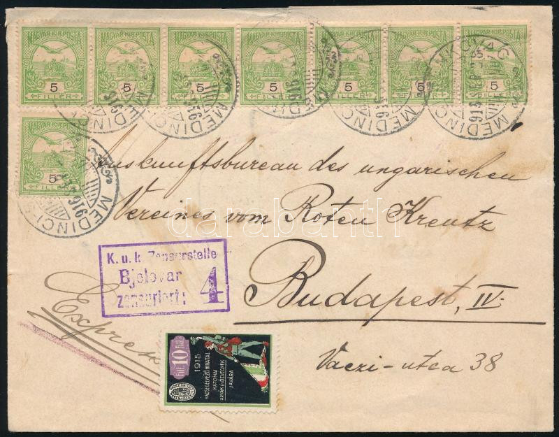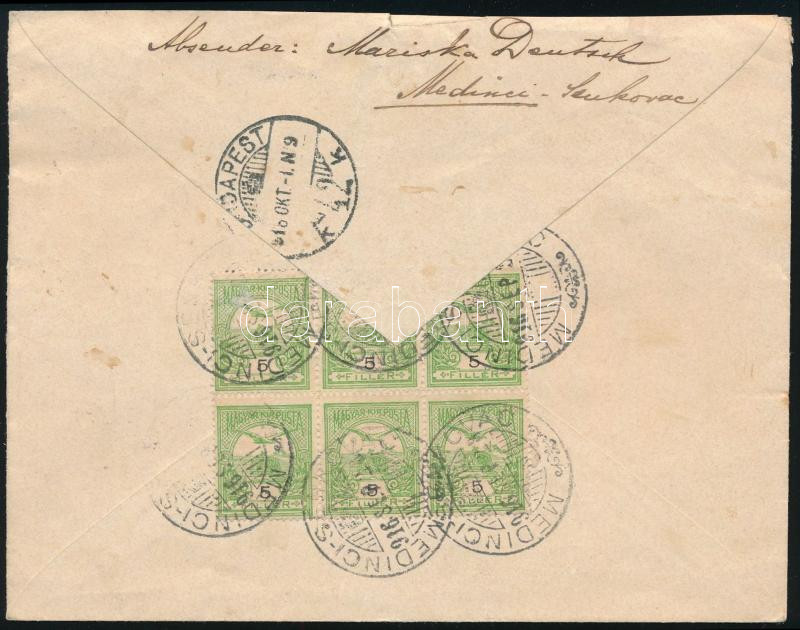 1916 Expressz levél 14 db Turul 5f bélyeggel bérmentesítve, levélzáróval / Express cover with 14 x 5f stamps + label, "MEDINCI-SENKOVAC" (Image)(Image 1)
