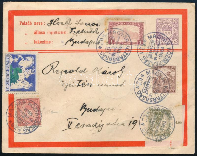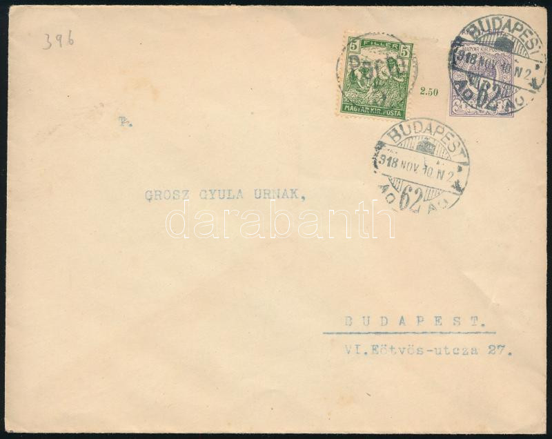 1918 Budapest helyi díjjegyes boríték szükségportóval / Local PS-cover with auxiliary postage due stamp (Image)(Image 1)