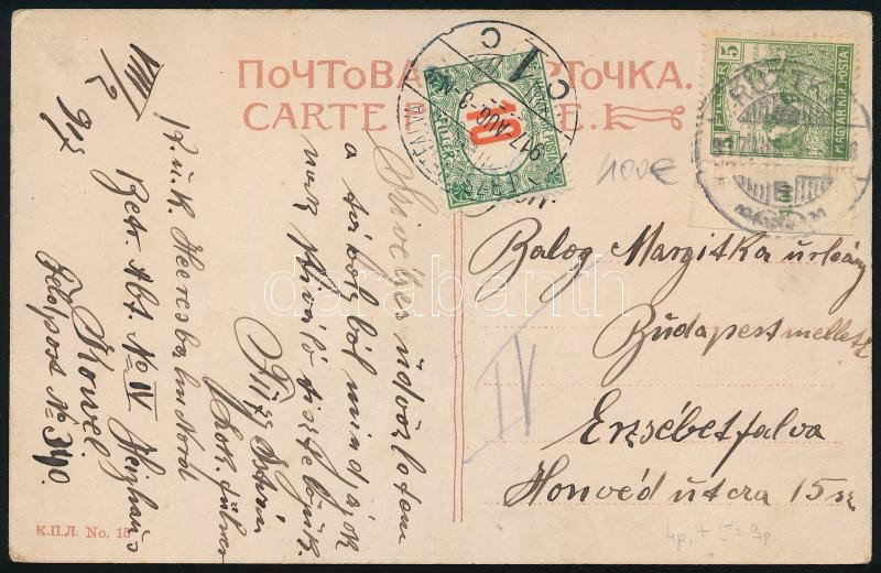 1917 Képeslap 5f bérmentesítéssel "RUTTKA" - "ERZSÉBETFALVA" 10f portóval / Postcard with 5f franking and 10f postage due stamp (Image)(Image 1)