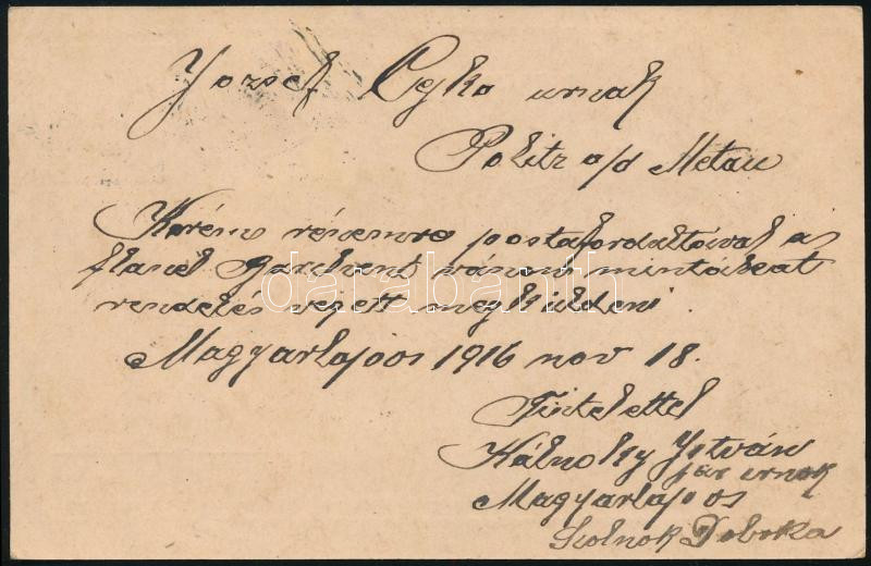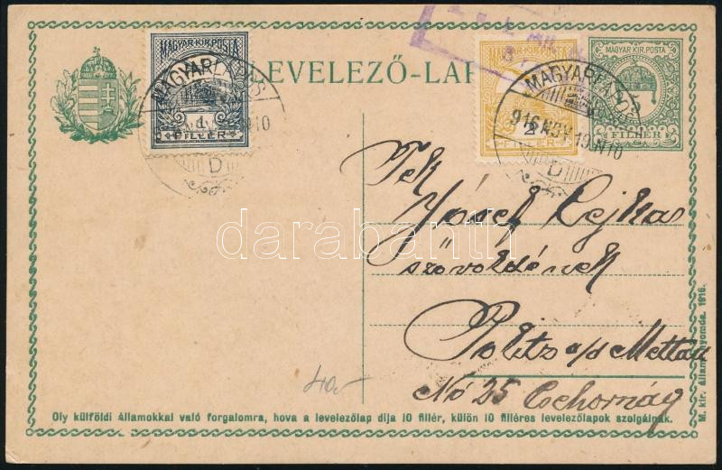 1916 Díjkiegészített díjjegyes levelezőlap Csehországba "MAGYARLÁPOS" / PS-card with additional franking to the Czech Republic (Image)(Image 1)