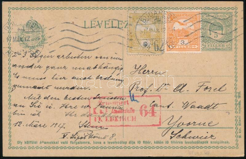 1917 Díjkiegészített díjjegyes levelezőlap Svájcba, cenzúrázva / Censored PS-card with additional franking to Switzerland (Image)(Image 1)