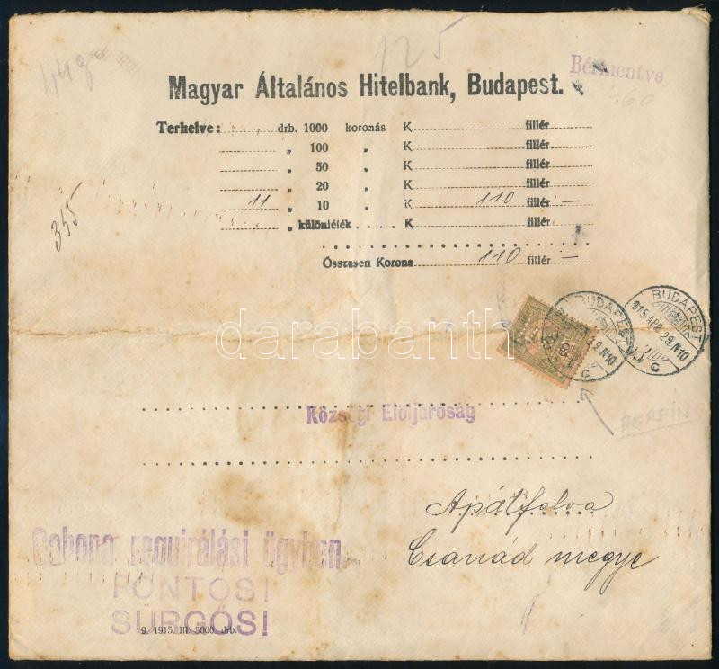1915 Pénzeslevél MÁH céglyukasztásos bélyeggel / Insured cover with perfin stamp (Image)(Image 1)