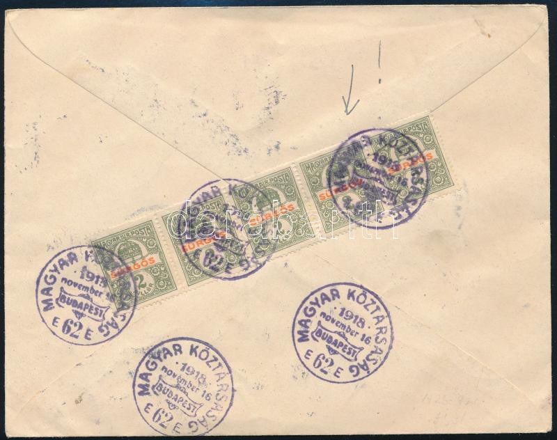 1918 Díjkiegészített díjjegyes boríték, rajta Sürgős ötöscsík "MAGYAR KÖZTÁRSASÁG BUDAPEST" alkalmi bélyegzés + levélzáró / PS-cover with additional franking and special cancellation + label (Image)(Image 1)