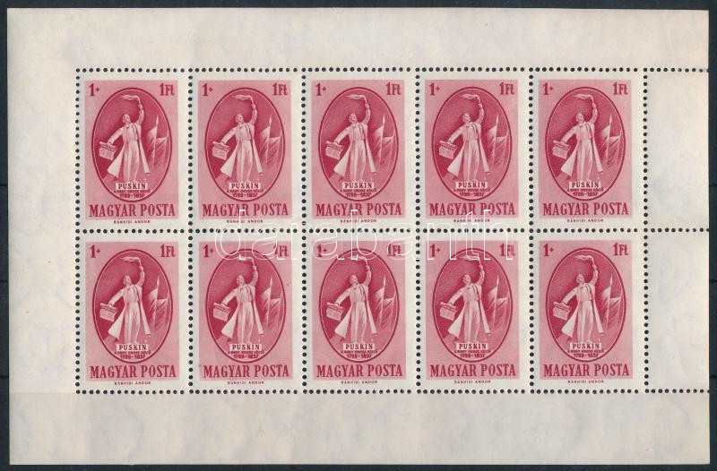 Nagyon jó minőségű Puskin 10-es kisív végigfutó fogazással (100.000) / Mi 1039 sheet of 10 (Image)(Image 1)