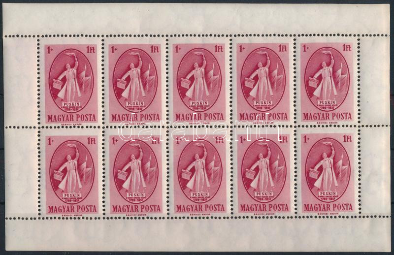 Puskin tízes ív bal oldalon fogazatlan ívszéllel, luxus állapotban! (120.000) / Mi 1039 sheet of 10 without horizontal perforation on the left margin (Image)(Image 1)
