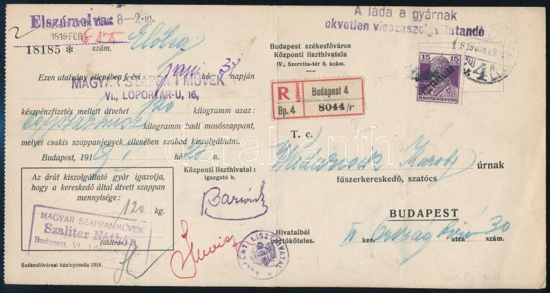 1919 Ajánlott Budapest helyi utalvány 15f bérmentesítéssel / Registered local coupon (Image)(Image 1)