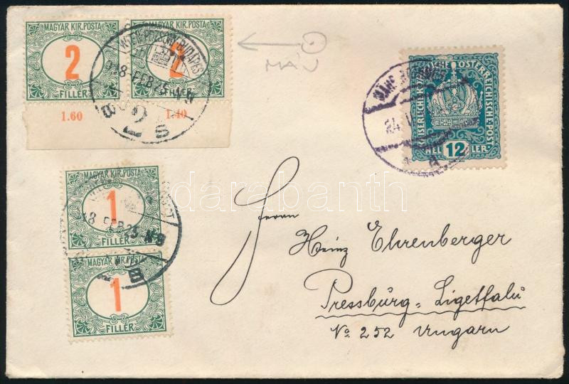 1918 Levél Ausztriából Pozsonyba 6f portóval, "WIEN-POZSONY-BUDAPEST" vasúti mozgóposta bélyegzésse / Cover from Austria with 6f postage due, with railway postmark (Image)(Image 1)