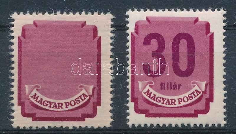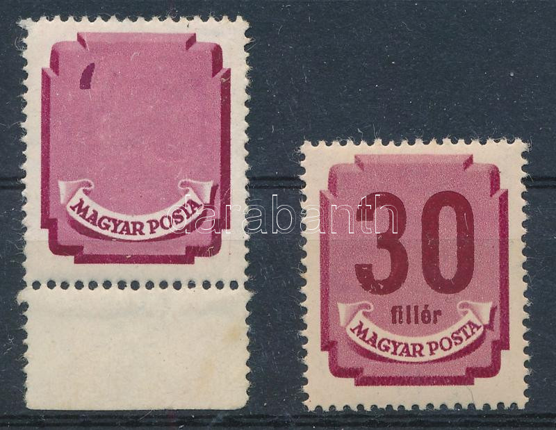 Forint-fillér portó (I.) ívszéli 30f az értékszám nagy része hiányzik. Az értékszám benyomata kivehető, valószínűleg papírdarab került az értékszám nyomásakor a bélyegre, így keletkezett ez az egyedi nyomat. / Postage due stamp, number 30 omitted.