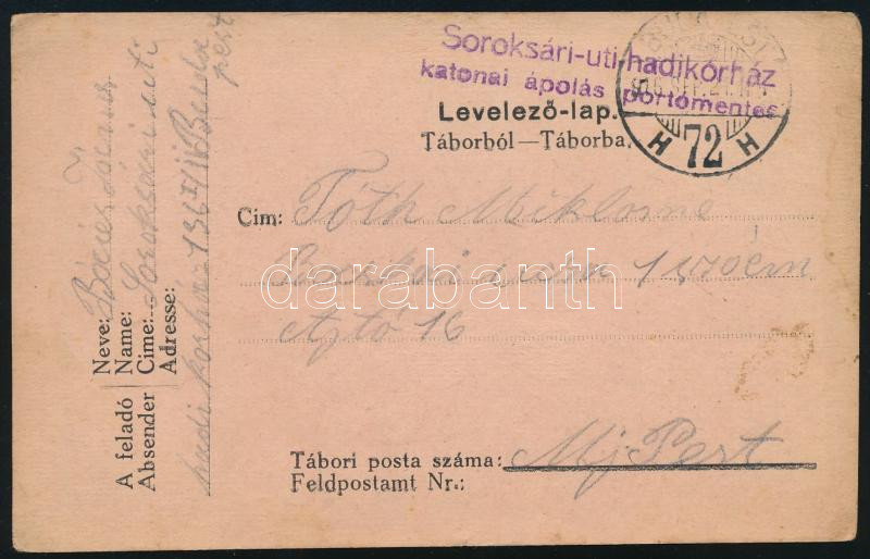 1916 Tábori posta levelezőlap / Field postcard "Soroksári úti hadikórház katonai ápolás portómentes" (Image)(Image 1)