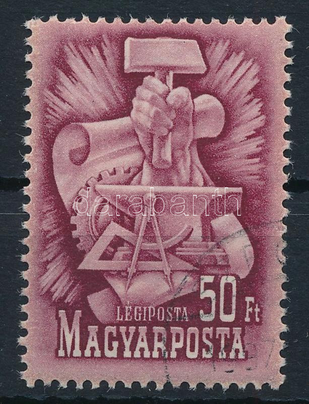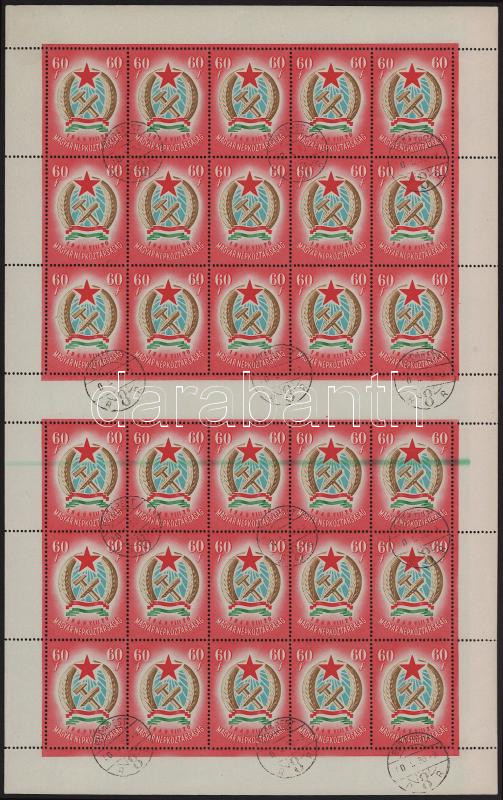 1949 Alkotmány 60f ívközéprészes teljes ív makkos vízjellel, látványos vízszintes zöld festékcsíkkal / Mi 1054 gutter complete sheet with large green paint stripe, factory watermark (Image)(Image 1)