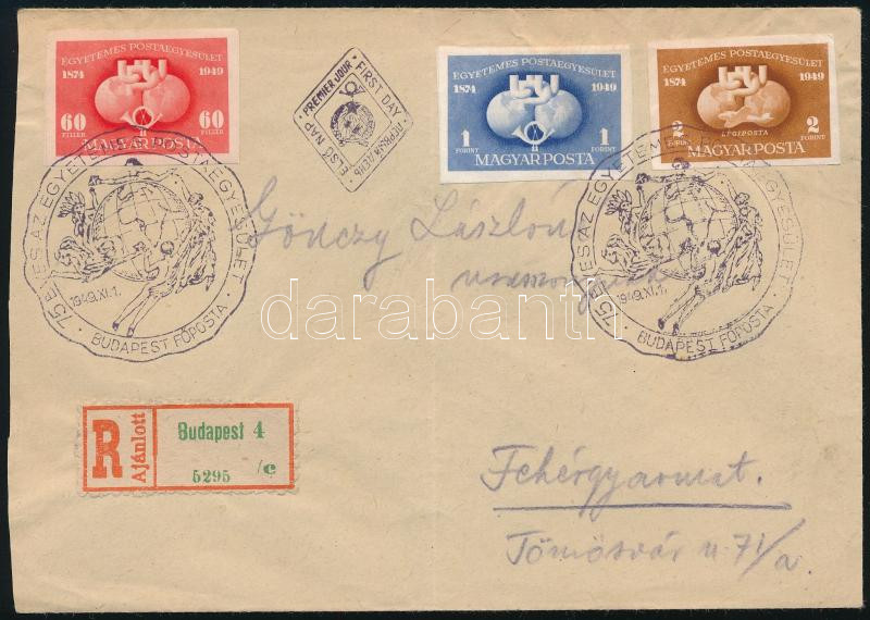 1949 UPU vágott sor ajánlott FDC-n / Mi 1056-1058 imperforate set on registered FDC (Image)(Image 1)