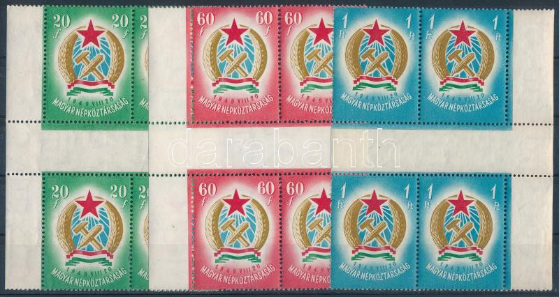 1949 Alkotmány sor ívközéprészes négyestömbökben (20f papírránc) / Mi 1053-1055 gutter blocks of 4 (20f paper crease) (Image)(Image 1)