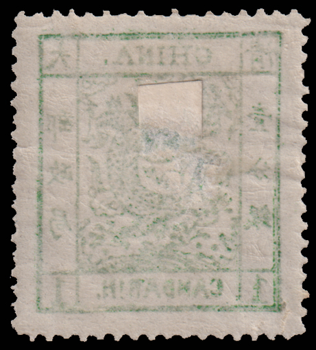 6 Mi:1 II, SG:4 image1882 Large Dragon 1ca green Wide Margin on Pelure paper, cliche 5 with full original gum, broken frame at top-left and some print offset on reverse, light thin spots on reverse and small tear at right. Chan:4c. 1882 大龙壹分银阔边绿法国薄纸,第五号子模,原胶贴纸,左上破框及透印,背有揭薄痕迹及右边小裂口. 陈目4c. (Image) (image11) (All Images)