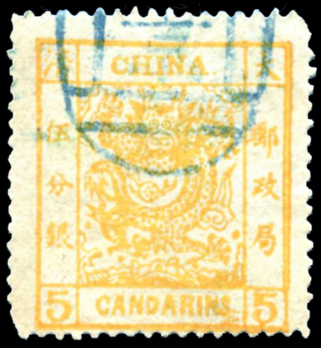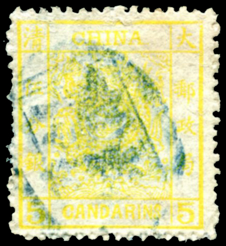 9 Mi:3 II, SG:6 image1882 Large Dragon wide margin 5ca yellow ochre, right side with double frame variety, short perfs. 1882 大龙阔边伍分银旧,右边框双线,短齿. (Image)