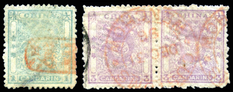 15 Mi:4-5A, SG:10-11 image1885 Customs Small Dragon 1ca with Wenchow seal (thin spot on reverse) and 3ca in pair with CUSTOMS WENCHOW DEC.31.96 cds. Scarce. 1885 海关一期小龙壹分银盖温州中文戳,叁分银双连盖温州海关DEC.31.96日戳,壹分银背有揭薄痕迹,少见. (Image)