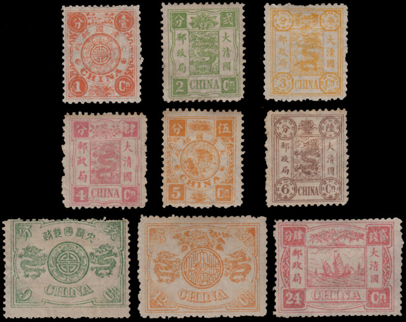 24 Mi:7-15A, SG:16-24 image1894 First Print Dowager Jubilee set with original gum mounted. 1894 慈禧寿辰纪念票9枚全新, 原胶贴纸. (Image)