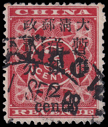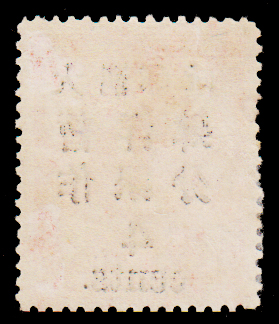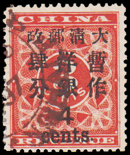 36 Mi:32 I, SG:90 image1897 Red Revenue, Large type 4c on 3c. With some overprint-offset on reverse. 1897 红印花3分加盖暂作洋银肆分大"4", 背有些许加盖透印. (Image) (image11) (All Images)
