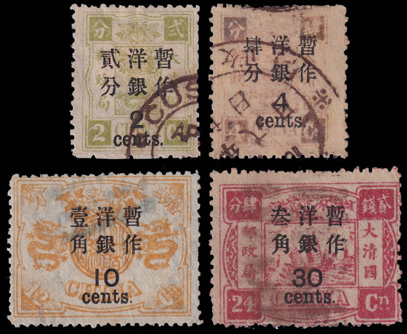 30 Mi:18-19IIIb,24-25IIIb, SG:59-60,64-65 image1897 surch. wide spaced large type on 2nd Dowager Empress stamps group of 4. VF 1897 慈寿再版加盖大字长距4枚信销. (Image)