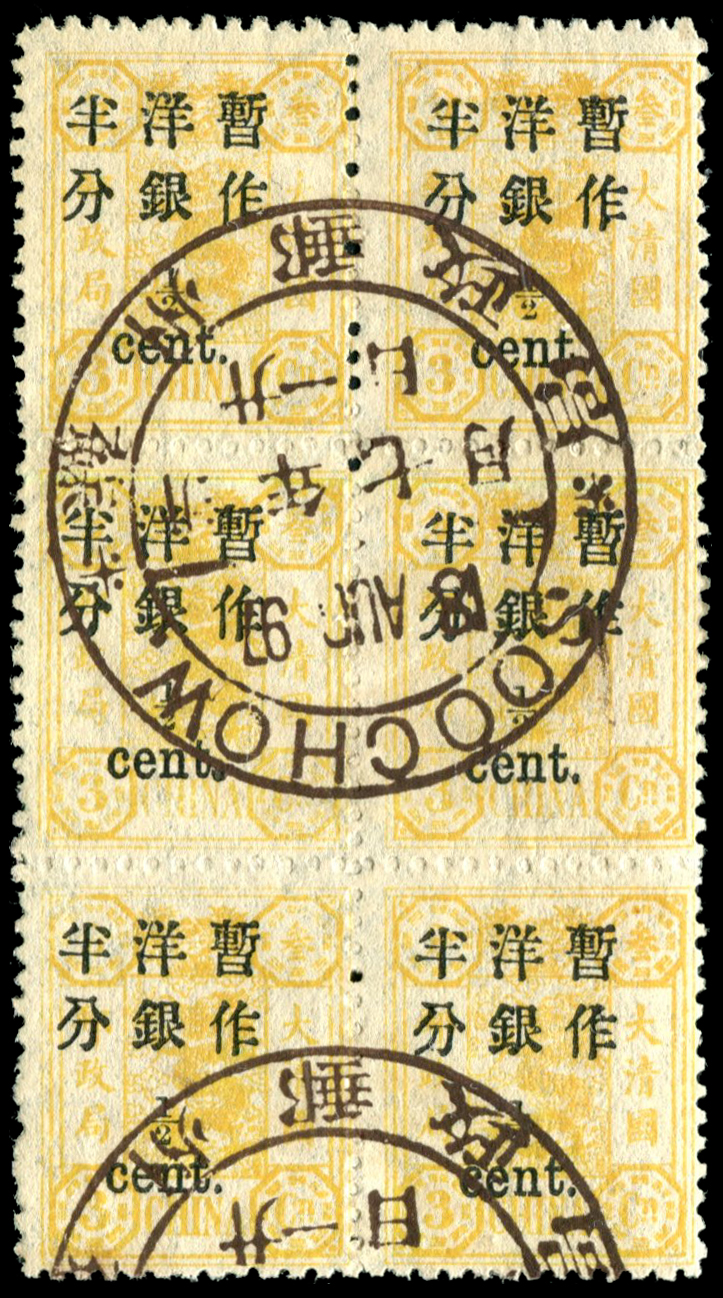 27 Mi:16 II, SG:37 image1897 Surch. small figure ½c on 1st print Dowager Jubilee 3ca block of 6 with SOOCHOW 18 AUG 97 Large Dollar cds. One stamps with "½"over "n" of cent variety,Chan:37f. Scarce Soochow large dollar dater. 1897 慈寿纪念票加盖小字半分于叁分6方连盖苏州大圆戳,其中一枚票"½"右移.苏州大圆戳较少见. (Image)