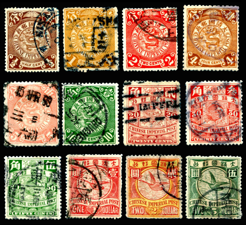 40 Mi:47-58, SG:108-119 image1898 2nd Imperial Issue Waterlow printing Coiling Dragon set with Wmk. VF 1898 大清二版华德路印刷蟠龙鲤鱼飛雁图12枚全带水印旧,无薄无裂. (Image)
