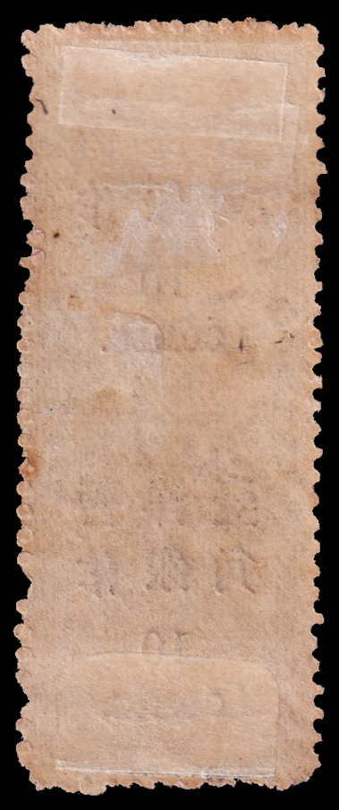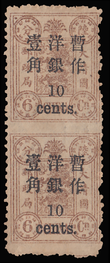 31 Mi:22 II, SG:43c image1897 Surch on 1st print Dowager Jubilee 10c on 6ca small figure vertical pair with imperforated between variety, very fine with original gum hinged and few insignificant age spots. SG:£16000, Chan:43c $7000. Two sheets were released with this variety, of the 32 examples possible 14 mint pairs and one used pair have been recorded as we known. 1897 慈寿原版小体加盖洋銀壹角於陸分銀票,棕色直雙連中縫漏齒變體,原膠貼紙; 難得的變體雙連票; 陳目43c, 這項變體有兩版被發現,應有32對變體票,但目前统计只有十四對新票及一對舊票. (Image) (image11) (All Images)