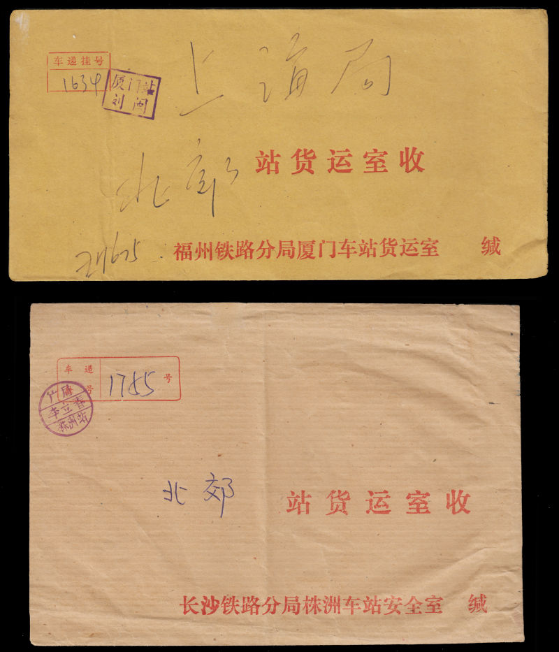 594 c   image1970 ´s Two Registered Train Delivery covers for internal railway mail, one from Xiamen (Amoy) to Shanghai and one from Zhuzhou to Shanghai. Covers folded. 1970 年代铁路车递挂号封2枚,一枚厦门寄上海,一枚株洲寄上海, 封有折. (Image)