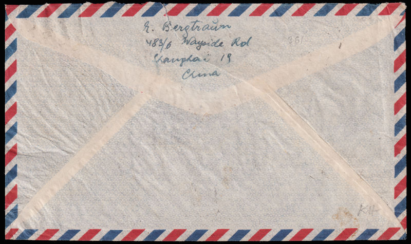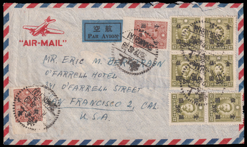 581 c   image1948 Dec. 13 Airmail cover sent from Shanghai to USA, franked with surch. Gold Yuan $5 on 17c Martyr block of 4 and pair, $1 on 40c SYS x 2 (one with imperforation at left variety) paying international airmail letter rate of $32, tied by Shanghai bilingual 13.11.48 cds, 2nd day of the new tariff. 1948 年12月13日上海寄美国航空封, 贴金圆加盖伍圆于17分烈士票四方连及单枚,壹圆加盖孙像40分两枚(其中一枚左边无齿),合计邮资金圆32圆符资, 销上海中英文双语日戳. 为调资第二日使用封. (Image) (image11) (All Images)