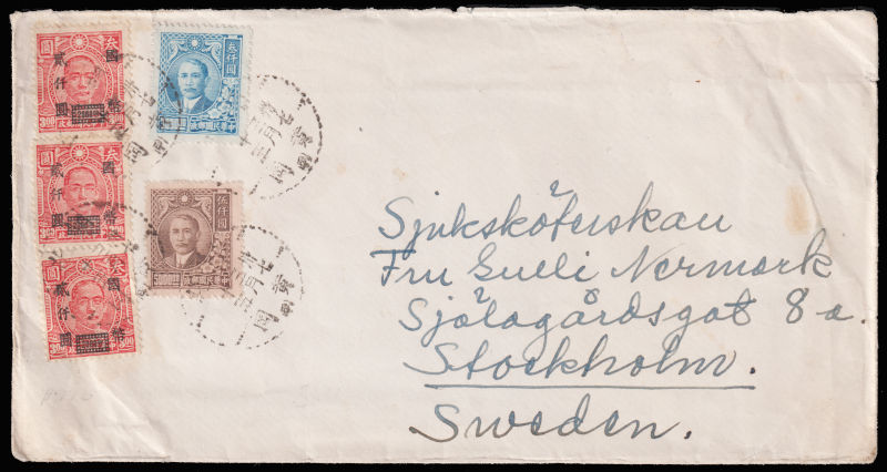 582 c   image1948 Mar. 15 cover sent from Hwanggang to Sweden, franked with surch. CNC$2000 on Chungking Chung Hwa print SYS $3 x 3, Shanghai 2nd Dah Tung print SYS$3000 and $5000 for paying $14000 international letter rate, tied by Hubei Hwanggang cds. Last day before introduce of the new tariff. 1948 年3月15日黄冈寄瑞典封, 贴国币改值加盖2000圆于重庆中华版孙像3圆三枚及上海大东二版叁仟圆和伍仟圆各一枚, 合计邮资国币14000圆符资, 销湖北黄冈中文日戳. 为调资前尾日使用封. (Image) (image11) (All Images)