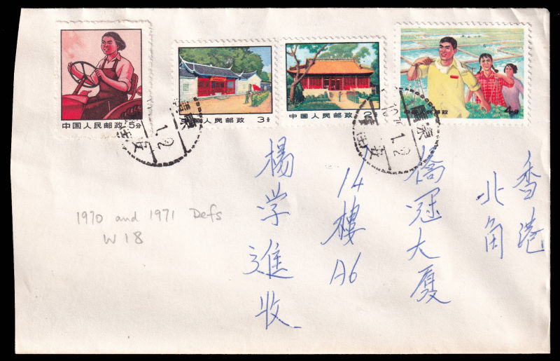 595 c   image1972 Jan. 2 Cover sent from Baoan to Hong Kong franked with 4c of W17 and 3 regular stamps, the 4c with missing buttons variety. 1972 年1月2日保安寄香港贴文17知青4分及3枚普票,4分票衣服漏印纽扣。 (Image)