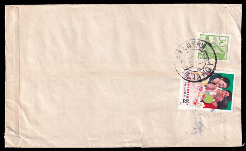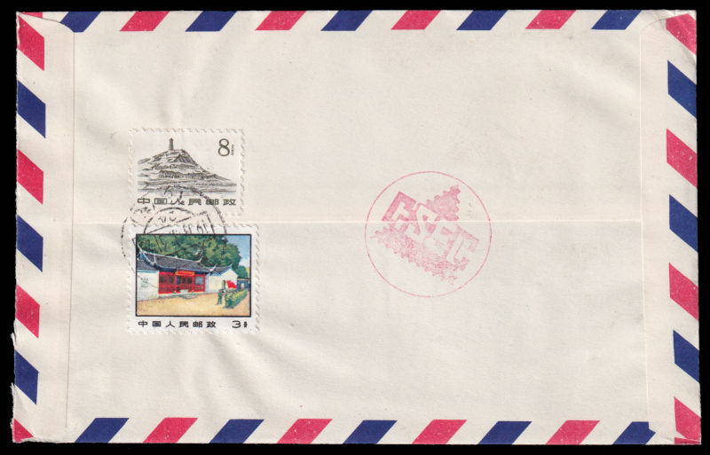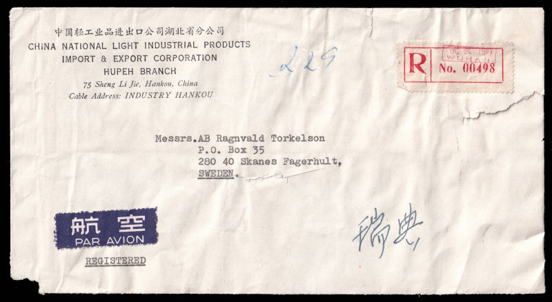 597 ★★   image1974 Jan. 19 Registered airmail cover sent from Wuhan to Sweden, franked on back with R14(4f) and R12(20f) strip of 4 (p11x11½). Scarce usage of 20f p11x11½ despite a tear at right (does not affect stamps). 1974 年1月19日武汉寄瑞典航空挂号封, 背贴普14(4分) 及 普12(20分四连粗齿). 20分粗齿票使用很少,多枚连票尤为罕见. 右侧有撕裂但不影响邮票. (Image) (image11) (All Images)