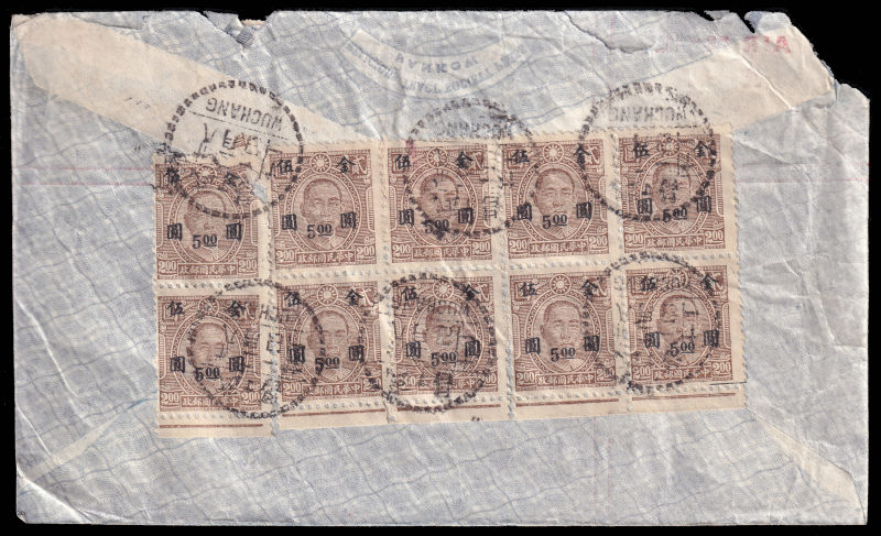 583 c   image1949 Feb. 1 Airmail cover sent from Wuchang to Sweden, franked on front with $10 Gold Yuan surch on $2 SYS x 2 and $5 on $2 x 2, on back $5 on $2 block of8 and a pair, paying international airmail postage of $80, tied by Wuchang bilingual cds. This rate was applied only for 3 weeks from 1949.1.16. 1949 年2月1日武昌寄瑞典航空封, 封面贴金圆拾圆加盖于重庆中华版孙像贰圆2枚及伍圆加盖于贰圆2枚,封背贴伍圆加盖于贰圆10枚, 合计国际航空邮资80圆, 销武昌中英文双语日戳,此资费只使用了3周. (Image) (image11) (All Images)