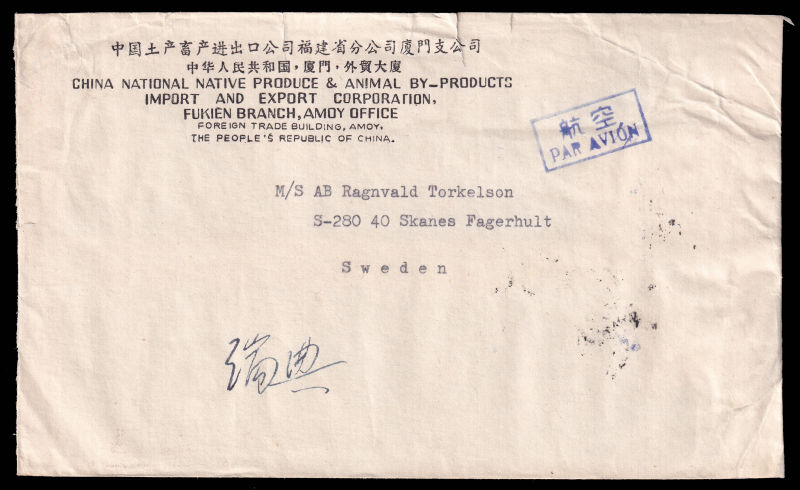 599 c   image1975 Airmail cover sent from Amoy to Sweden, franked with N48 Table Tennis 22f and 30c regular stamps, tied by Amoy dater for foreign mails. 1975 年厦门寄瑞典航空封, 贴编号48亚乒赛22分, 盖出口戳. (Image) (image11) (All Images)