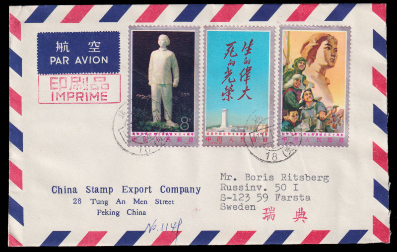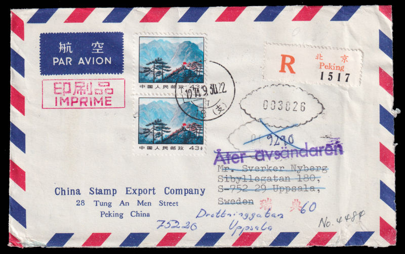 598 c Mi:1092, SG:2464 image1974 R14/43f vertical pair on official cover sent by registered airmail of China Stamp Export Company to Sweden, Uppsal 12.10.74 arrival cds on reverse, with "Return to sender" chopmarking and re-addressed with rectangular violet "Postal complaints office 14 OKT 1974" chop. 1974 普14/43分直双连北京总公司公文封航空挂号寄瑞典, 背盖乌普萨拉12.10.74到达戳, 手盖"退回寄件人",改寄新地址, 盖"斯德哥尔摩邮政投诉办公室10月14日1974年"紫色长方形戳. (Image) (image11) (All Images)
