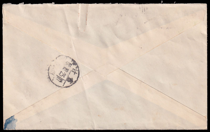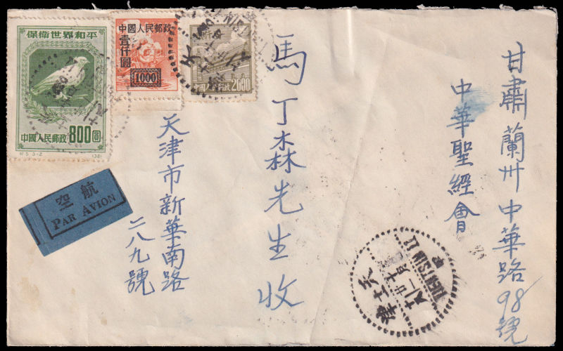 584 PSC   image1950 Oct. 21 Airmail cover sent from Tianjin to Lanzhou, franked with C5(3-2) original print, R1/2000y and surch. 1000y on Unit stamp, total 3800y, with arrival cds on reverse. cover folded once but not effect the stamps. 1950 年10月21日天津寄兰州航空封, 贴纪5(3-2)原版, 普1/2000圆及改1/1000圆, 封背盖兰州到达戳. 封有一折但不影响邮票. (Image) (image11) (All Images)