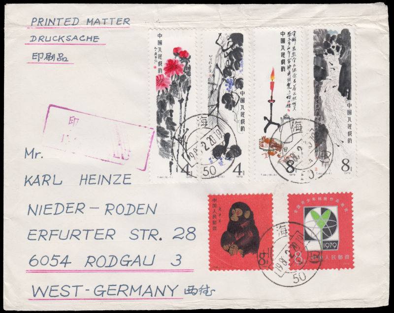 613 c   image1980 Feb.20 Printed Matter cover sent from Shanghai to West Germany, franked with T46 Year of Monkey and T44 Qi Baishi stamps. Beautiful cover. Cover with wrinkles on top. 1980 年2月20日上海寄西德印刷品封, 贴T46猴票及4枚齐白石票, 封上边有折痕. (Image) (image11) (All Images)