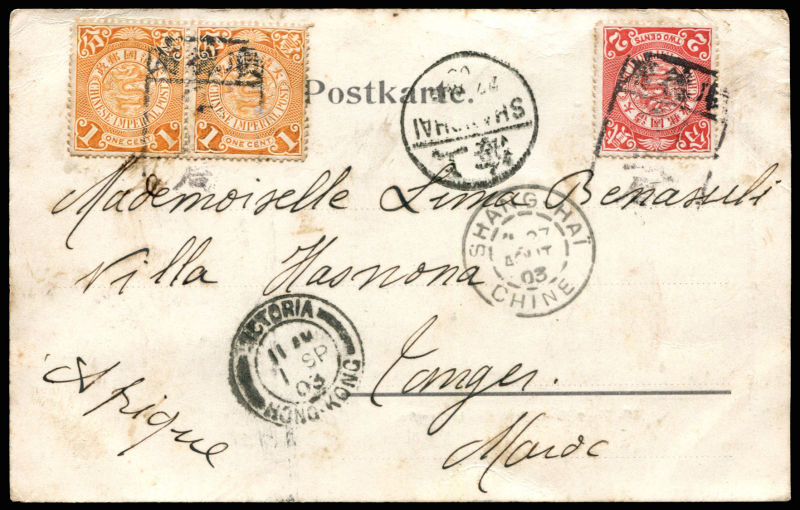 620 PPC   image1903 AUG. PPC with Graf Waldersee in Tongku design sent from Shuntefou to Morocco, franked with 1c pair and 2c Coiling Dragon stamps cancelled with Shuntefou Postoffice tombchop, with Peking, Shanghai transit and French Shanghai Postoffice for despatch via Hong Kong 1.SEP. Scarce Africa destination. 1903 年8月 格拉夫·瓦德西在塘沽明信片, 由河北顺德府寄摩洛哥, 贴蟠龙1分双连及2分销顺德府碑型戳, 经北京盖2?AUG1903椭圆戳, 上海及法国在华28AUG03中转, 经香港盖VICTORIA 1.SEP戳.少见寄非洲盖碑型戳片. (Image) (image11) (All Images)