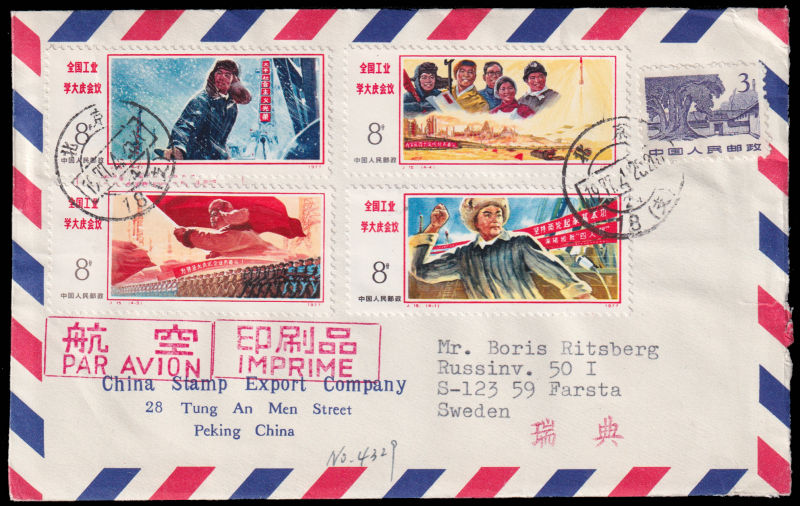 603 FDC Mi:1343-46, SG:2715-18 image1977 Conference in Learning from Tashing set on official cover sent by airmail of China Stamp Export Company on first day of issuring to Sweden, additionally franked with R11/3f. VF with original documents included. 3f on cover is scarce. 1977 J15全国学大庆会议4枚全北京总公司公文封首日航空寄瑞典, 加贴普11/3分. 带原始函件,普11/3分信销少见. (Image) (image11) (All Images)