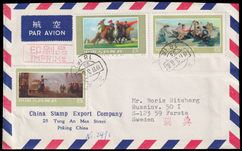 605 FDC Mi:1386-88, SG:2758-60 image1978 Learn from Comrade Lei Fen set on official cover sent by airmail of China Stamp Export Company on first day of issuring to Sweden, additionally franked with R16/1f. VF 1978 J26向雷锋学习3枚全北京总公司公文封首日航空寄瑞典, 加贴普16/1分. (Image) (image11) (All Images)