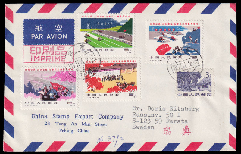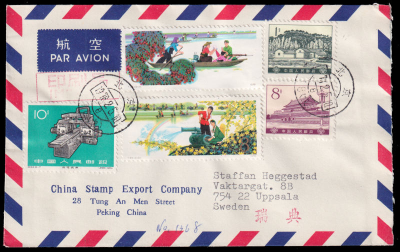 604 FDC Mi:1381-82, SG:2753-54 image1978 The Army and People set on official cover sent by airmail of China Stamp Export Company on first day of issuring to Sweden, additionally franked with S62(8-7),R16/1f and R16/8f. 1978 T23军民一家人2枚全北京总公司公文封首日航空寄瑞典, 加贴特62(8-7),普16/1分及普16/8分. (Image) (image11) (All Images)