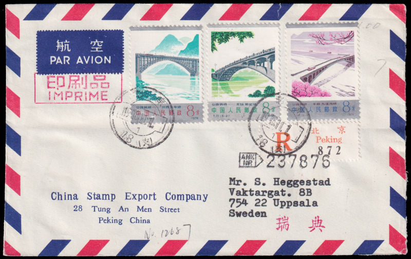 608 FDC Mi:1457-61, SG:2829-33 image1978 Highway Arch Bridges set on official cover sent by registered airmail of China Stamp Export Company on first day of issuring to Sweden, additionally franked on reverse with J34(2-2). 1978 T31公路拱桥4枚全北京总公司公文封首日航空挂号寄瑞典, 封背加贴J34(2-2). (Image) (image11) (All Images)