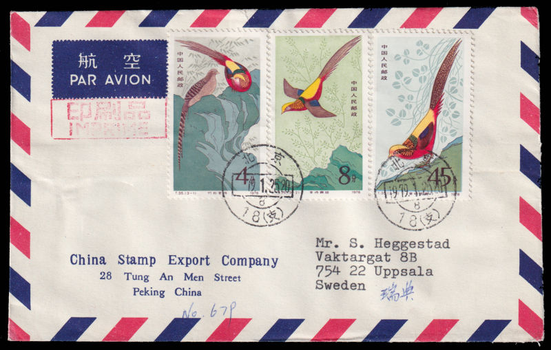 610 FDC Mi:1475-77, SG:2847-49 image1979 Golden Pheasant set on official cover sent by airmail of China Stamp Export Company on first day of issuring to Sweden. 1979 T35金鸡3枚全北京总公司公文封首日航空寄瑞典. (Image) (image11) (All Images)