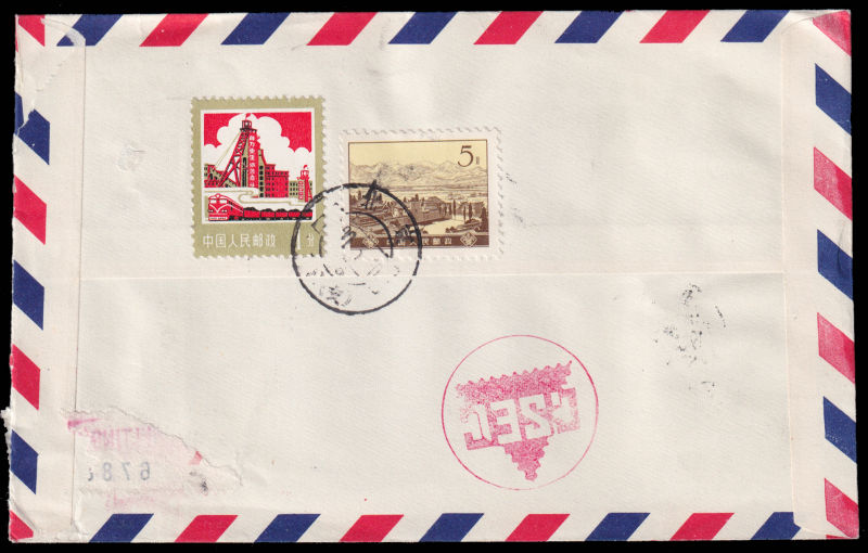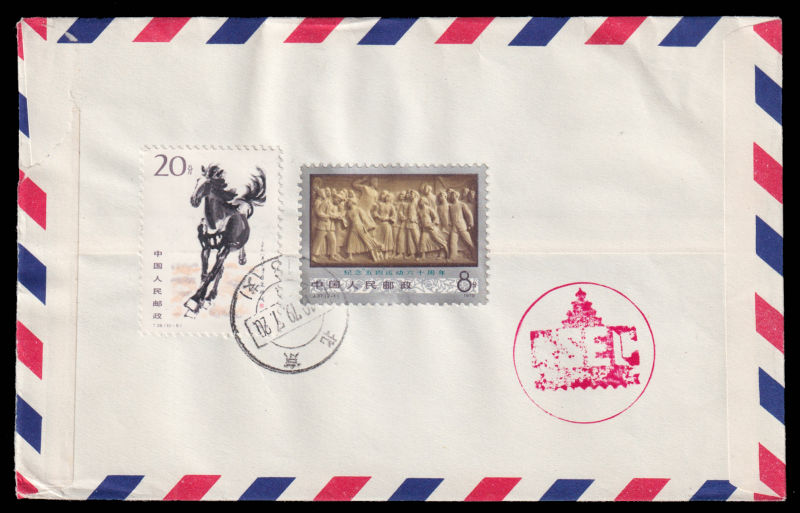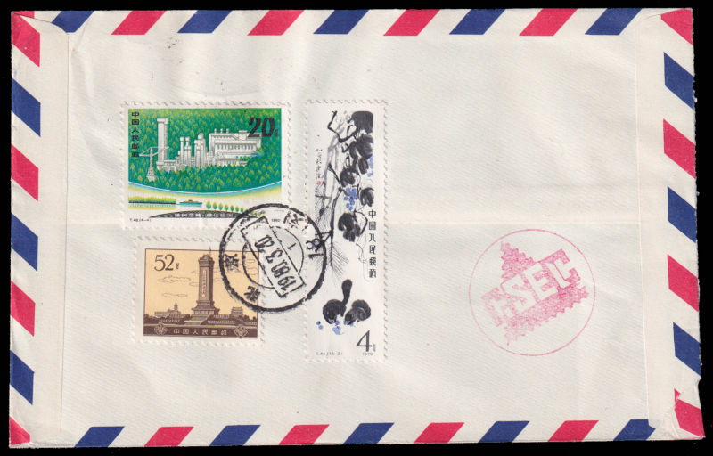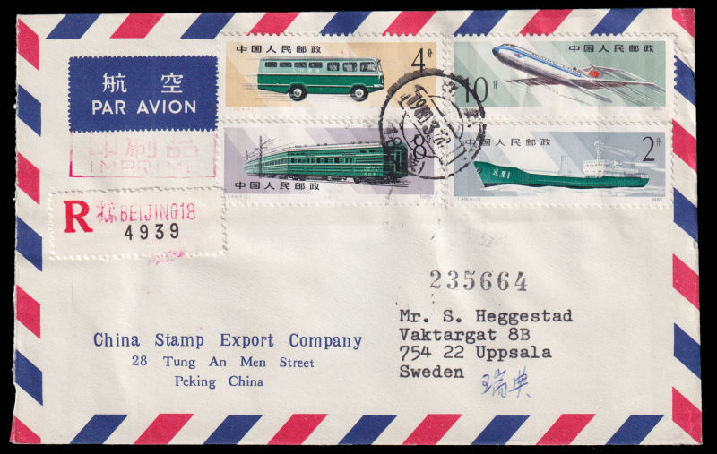 615 FDC Mi:1601-04, SG:2975-78 image1980 Mail Transport set on official cover sent by registered airmail of China Stamp Export Company on first day of issuring to Sweden, additionally franked on reverse with T44(16-2),T48(4-4) and R16/52f. 1980 邮政运输4枚全北京总公司公文封首日航空挂号寄瑞典, 封背加贴T44(16-2),T48(4-4)及普16/52分. (Image) (image11) (All Images)