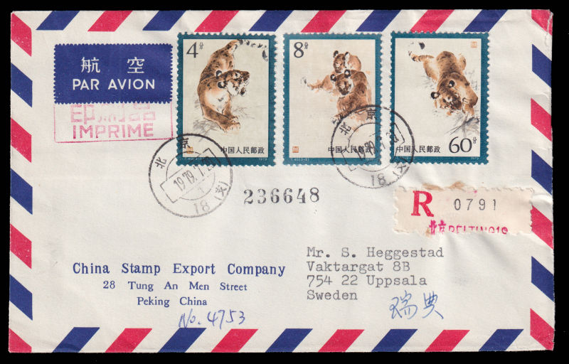 611 FDC Mi:1494-96, SG:2866-68 image1979 The Manchurian Tiger set on official cover sent by registered airmail of China Stamp Export Company on first day of issuring to Sweden, additionally franked on reverse with J37(2-1) and T28(10-5). 1979 T40东北虎3枚全北京总公司公文封首日航空挂号寄瑞典, 封背加贴J37(2-1)及 T28(10-5). (Image) (image11) (All Images)